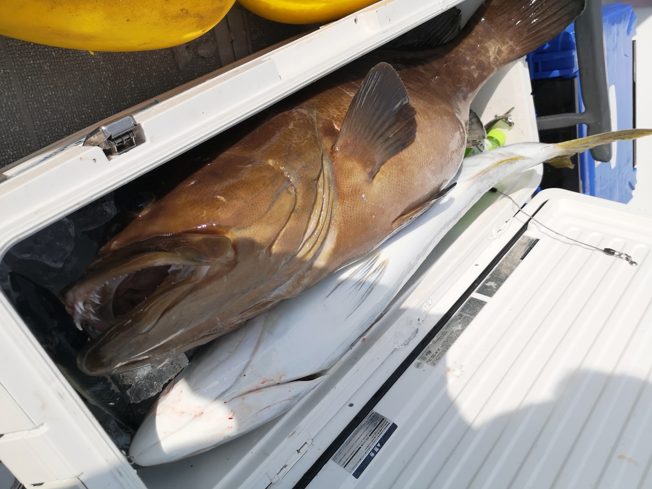 大島フィッシング 8月11日 大阪 立木氏 ブリ 90 3匹 センカイカセ クーラーに入らなかったので1匹リリースしました 大島フィッシング 大島カセ カセ釣り センカイカセ イワシフカセ 釣果